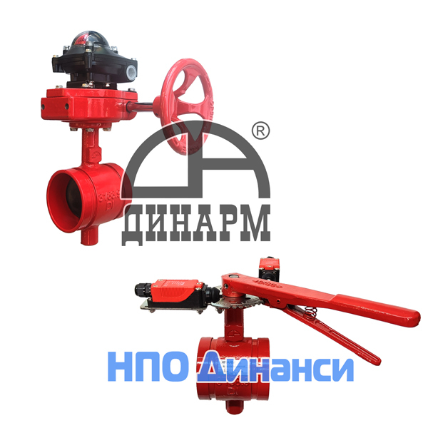 Затвор дисковый, поворотный, грувлочный Динарм мод. Machaon BFV-01/GR с ручным приводом и встроенными концевыми выключателями на 2 положение "открыто-закрыто" и модель Machaon BFV-01/GR и Machaon BFV-02/GR, с редуктором-рулем и концевыми выключателями "открыто-закрыто"